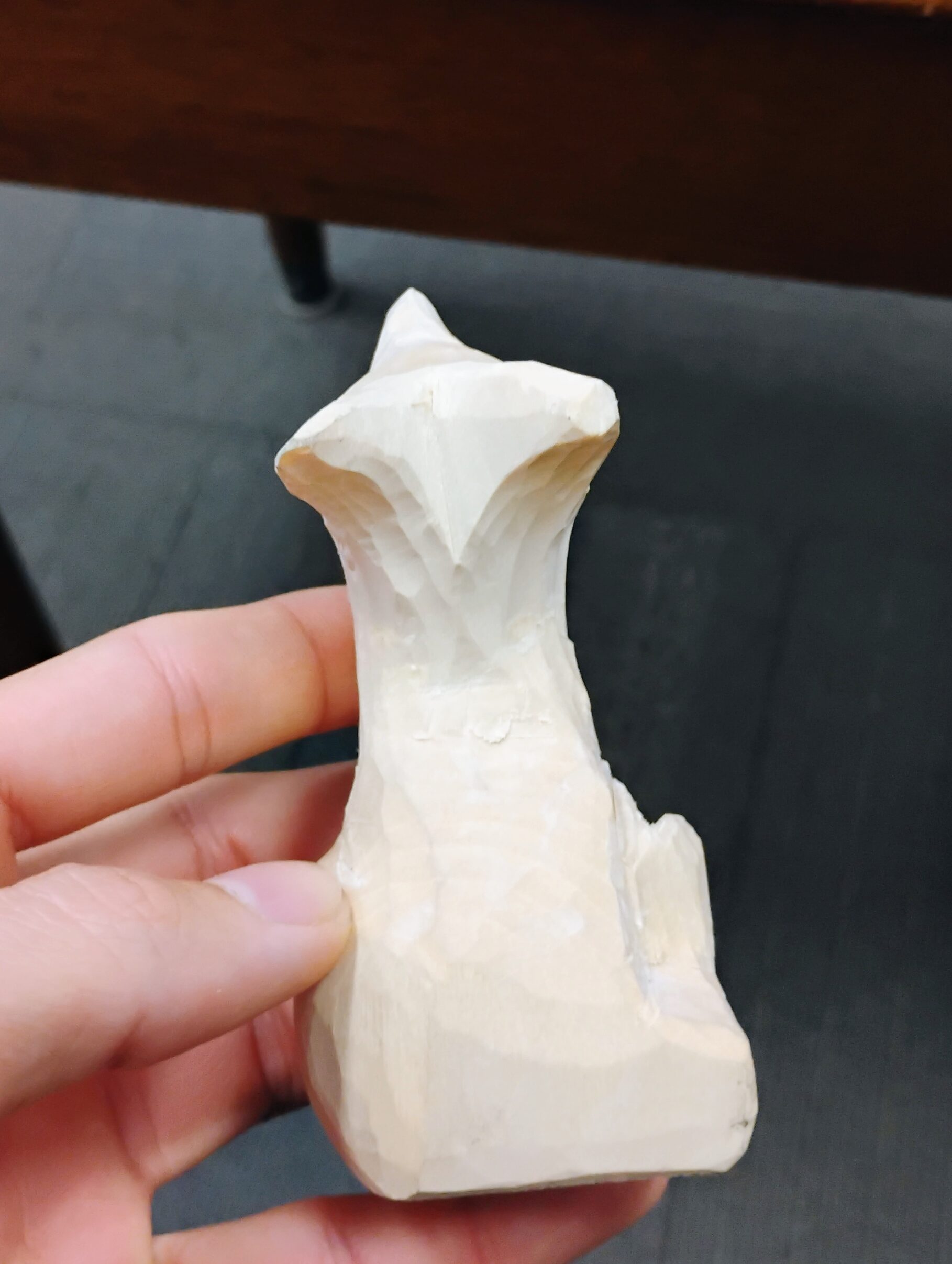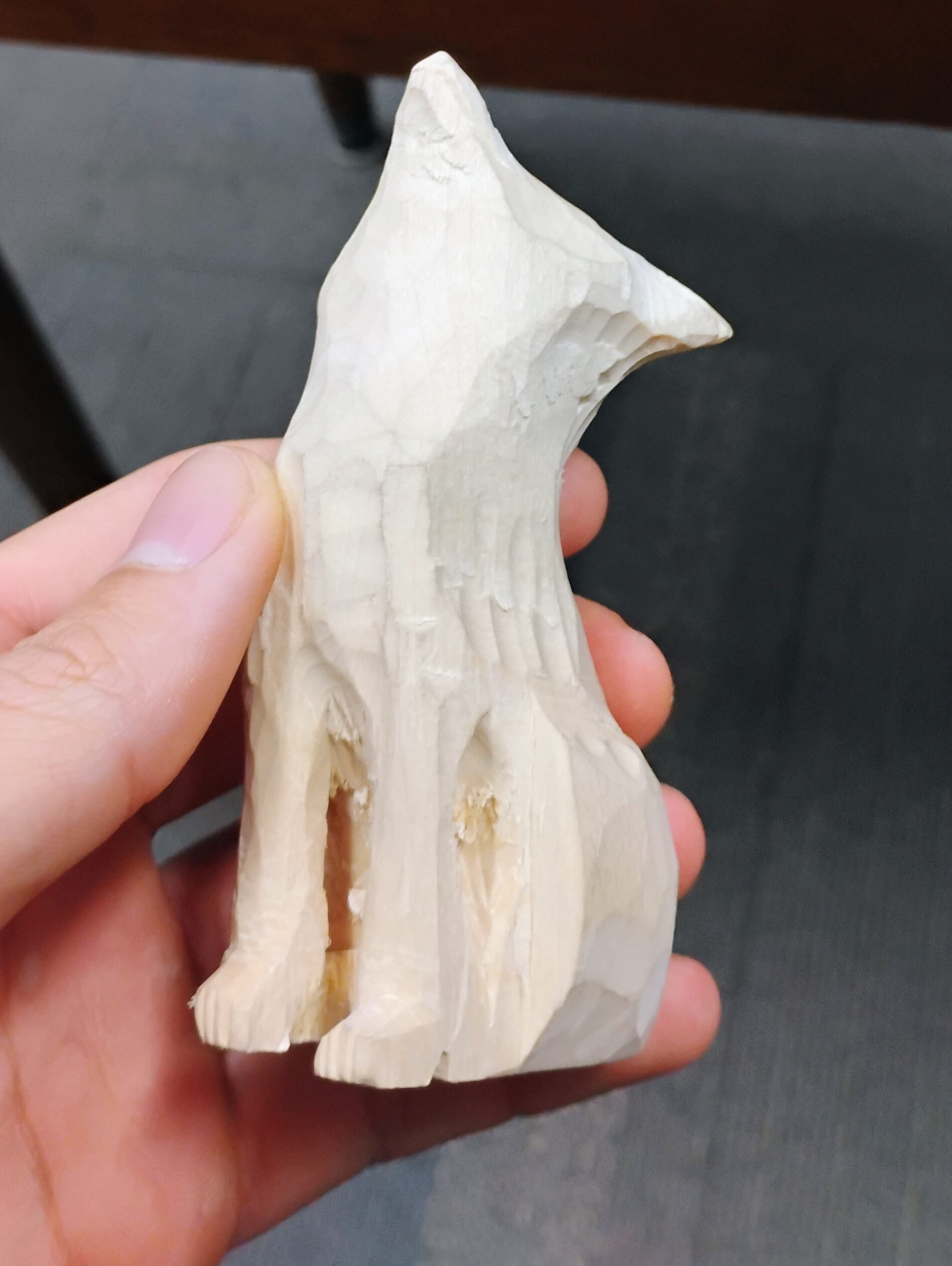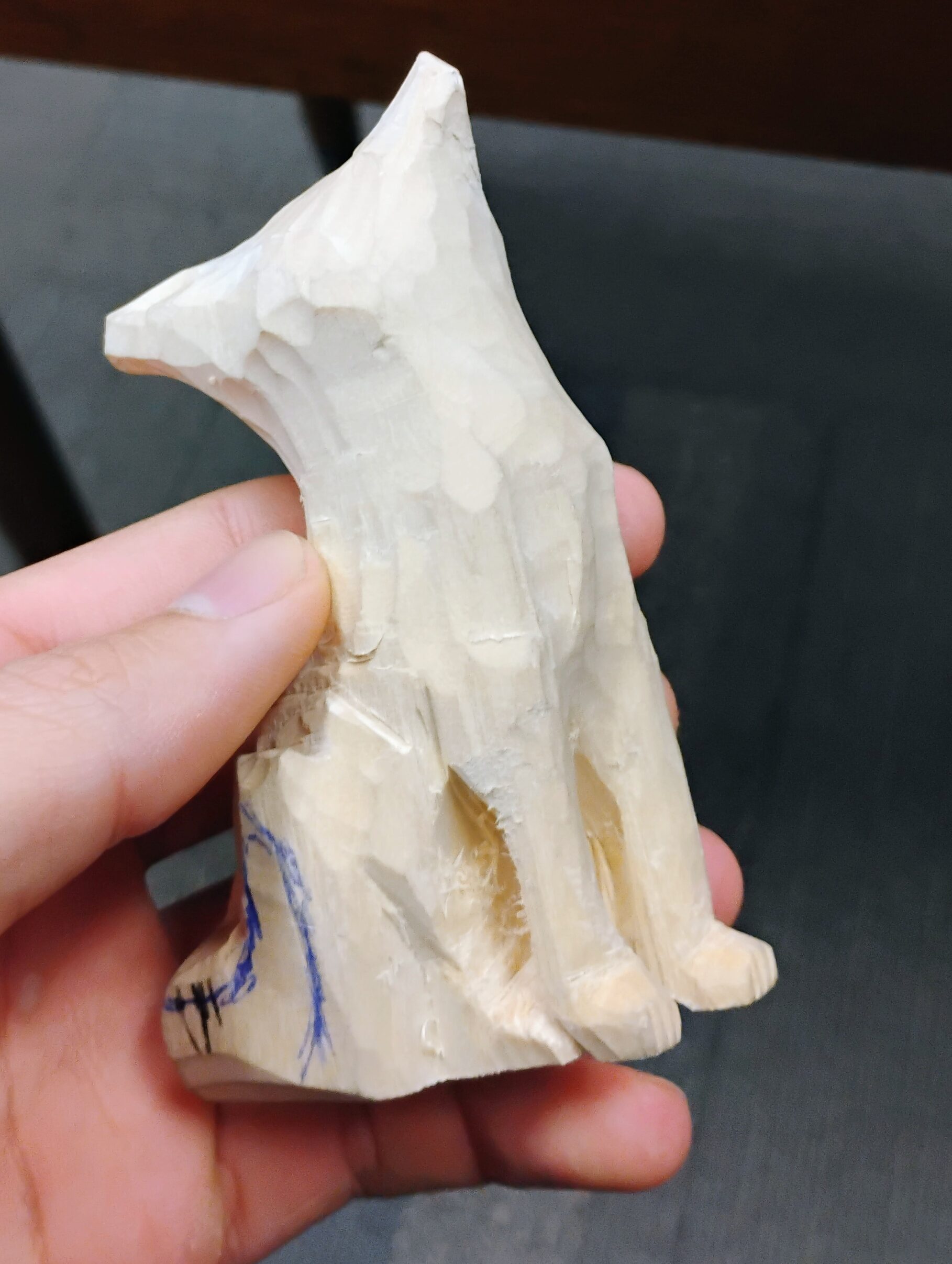 This wolf was made for my friend. It is my third carving project. As of now, it is currently a work in progress. I intend on finishing the tail, as well as detailing the back legs a bit more. You can see that the right back leg is not as defined as the left back leg. I believe that is because of the angle at which the leg comes out. There is no flat bit that then comes out, as demonstrated in this poor drawing:
